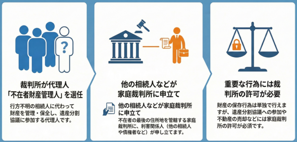 選任された管理人は、行方不明の相続人の代理として、遺産分割協議に参加したり、財産を保全したりします。