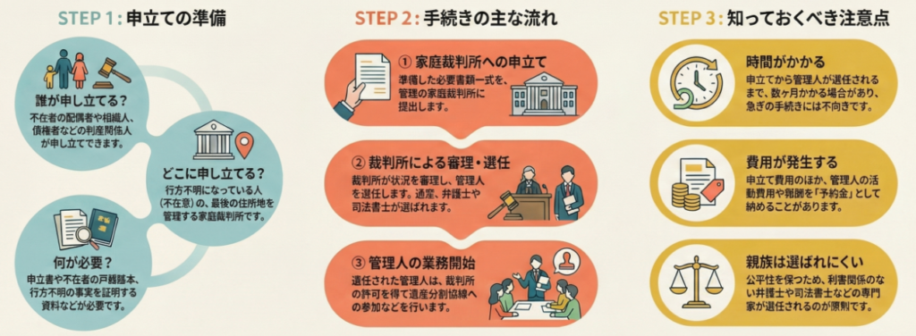 裁判所が不在者の状況や相続の背景を審理した上で、管理人を選任します。