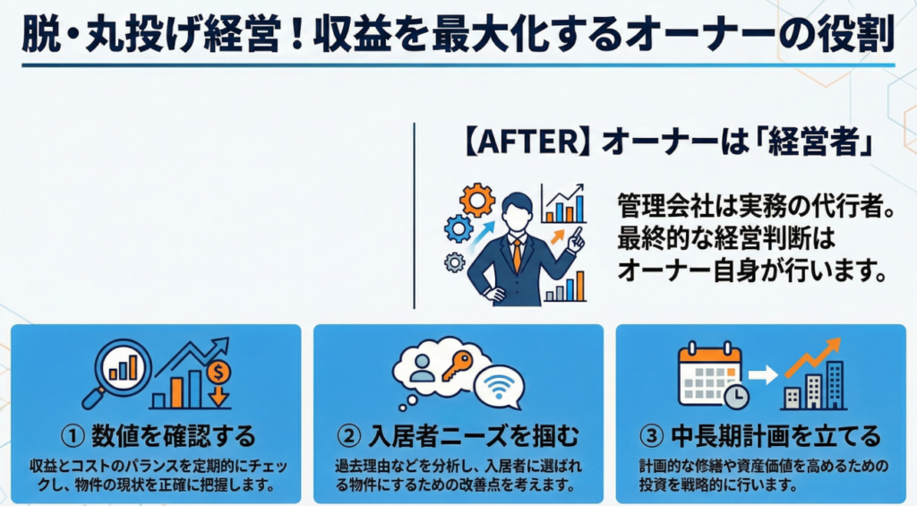 管理会社はあくまで“実務の代行者”であり、“経営判断”をするのはオーナー自身です。