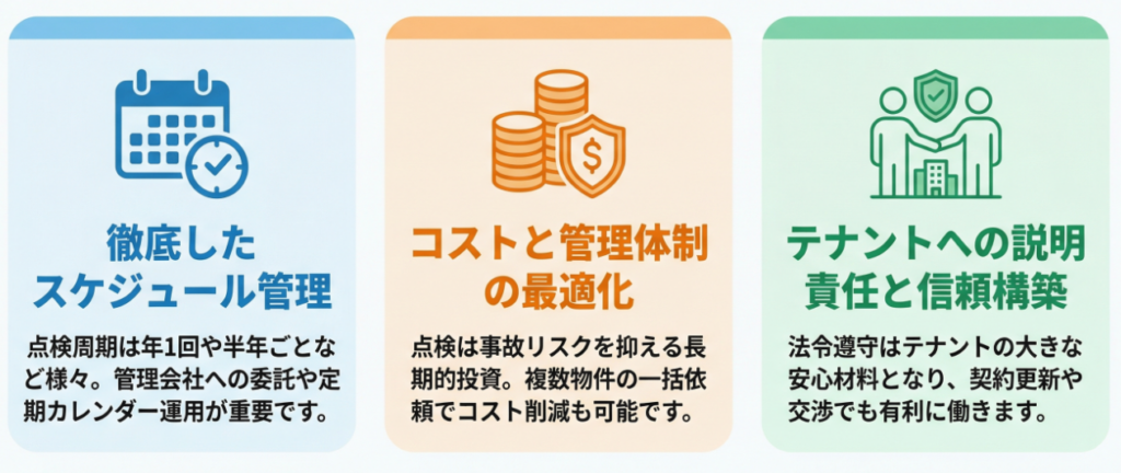 特に高所得者の不動産オーナーや小規模ビルの所有者は、「管理コスト」と「テナント満足度」のバランスを考慮しながら、スケジュール管理と法令遵守を徹底する必要があります。