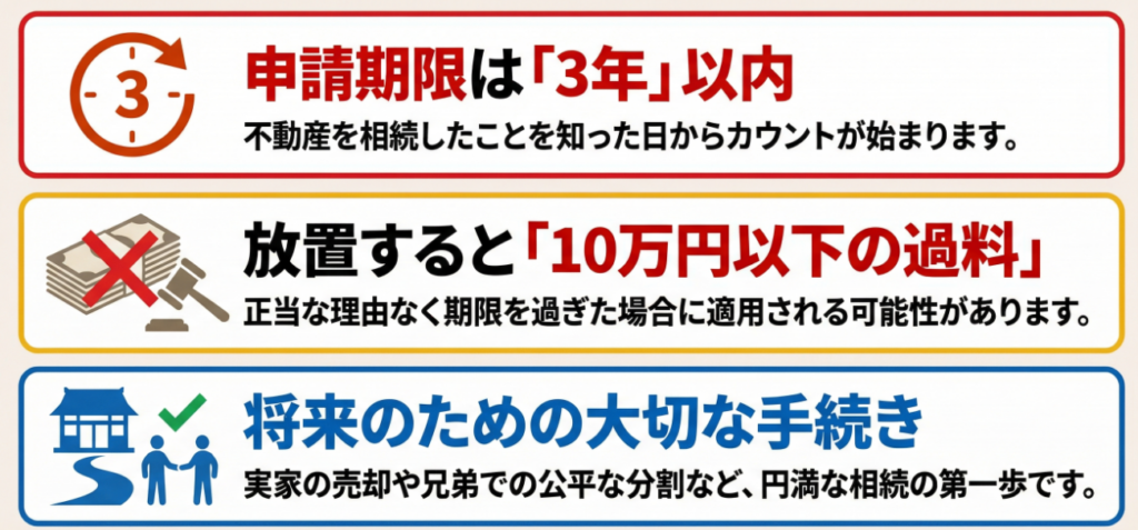相続登記の申請には、「不動産を相続したことを知った日から3年以内」という期限が設けられました 。