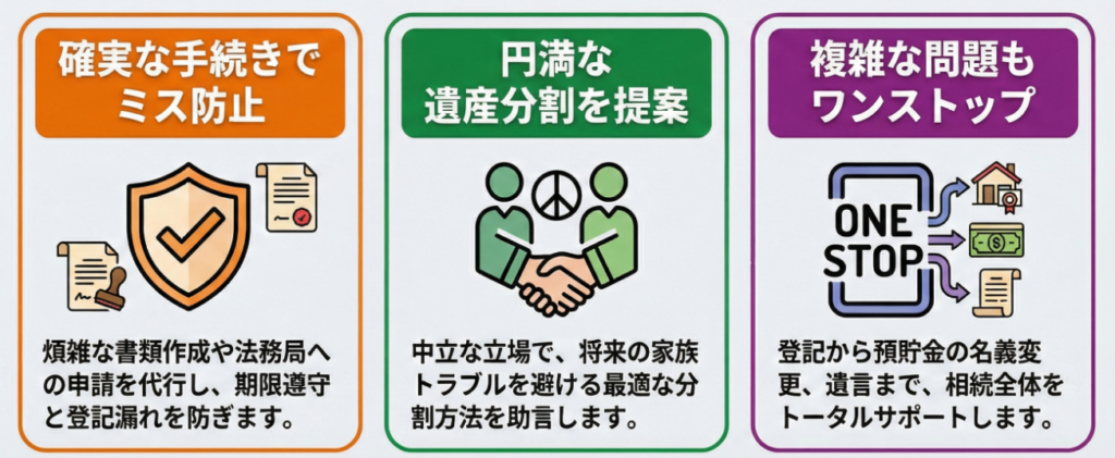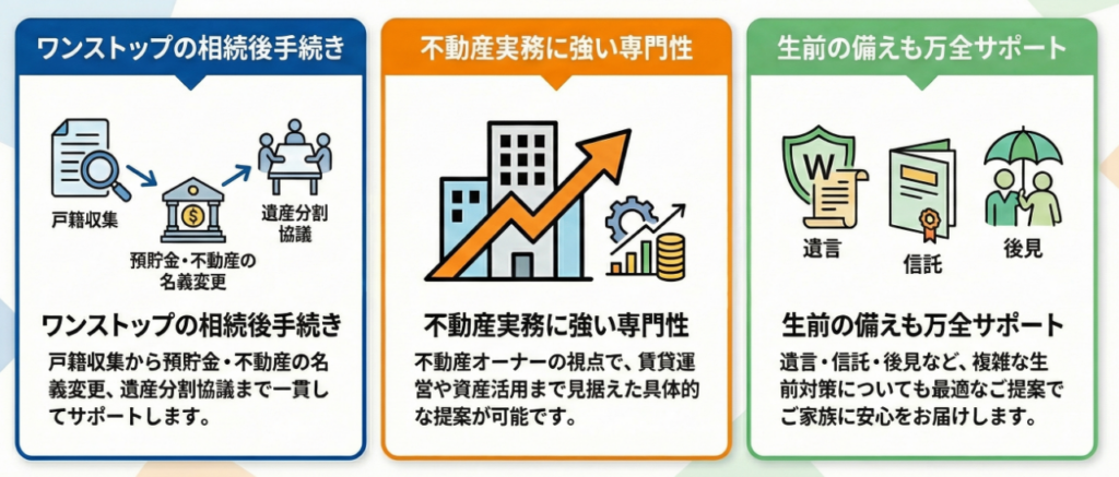 - トータルサポートの実現: 相続発生後の「戸籍収集から預貯金・不動産の名義変更、遺産分割協議まで」を一貫してお手伝いできます。