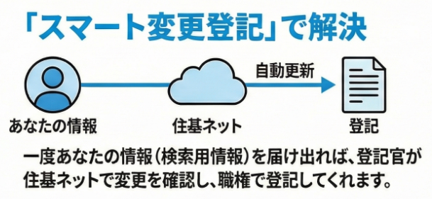 • 負担軽減の鍵: スマート変更登記は、登記官が住基ネット情報を基に所有者の了解を得た上で職権で変更登記を行う制度です。