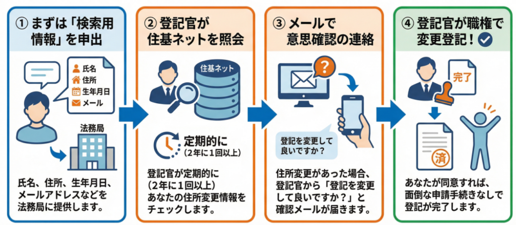 スマート変更登記の最大のメリットは、所有者が変更登記の申請をしなくても、登記官が職権で登記を行ってくれる点です。登記官は、所有者からあらかじめ提供された「検索用情報」を用いて、住民基本台帳ネットワークシステム(住基ネット)の情報を定期的に検索します。