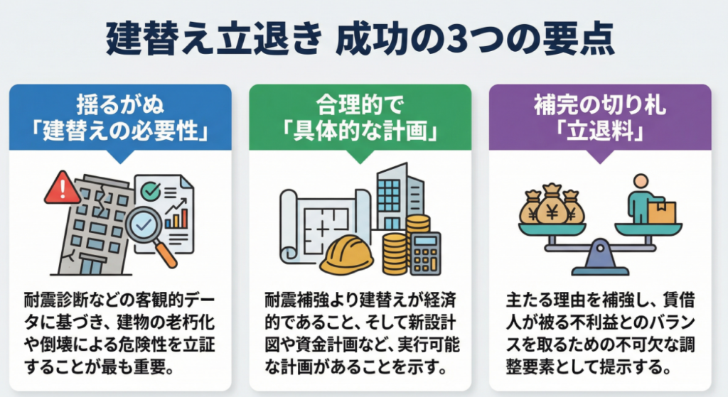 最終的な成功の鍵は、建物の老朽化・耐震性能不足という客観的な事実を基盤とし、それを裏付ける経済的な合理性と具体的な再利用計画を提示した上で、賃借人の不利益を適切に補完する立退料を提示するという、賃貸人側の事情を多角的に構成することにあります。