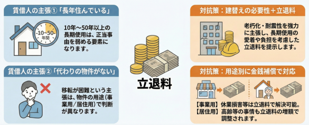 実際には、使用期間が長期であっても、立退料の支払によって正当事由の存在が補完され、明渡しが認められるケースが多く見られます。オーナー側としては、老朽化や耐震性など「建替えの必要性」を強力に主張するとともに、長期使用による賃借人の愛着や転居負担を考慮した立退料を提示することが有効な対抗策となります。