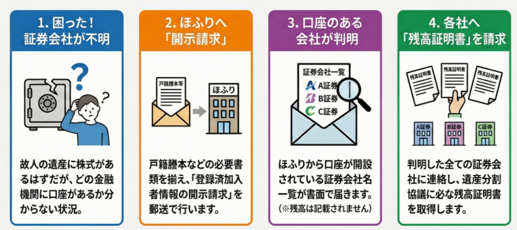 • 証券会社が不明な場合: 「証券保管振替機構(ほふり)」に登録済加入者情報の開示請求を行うことで、口座がある証券会社を特定できます。